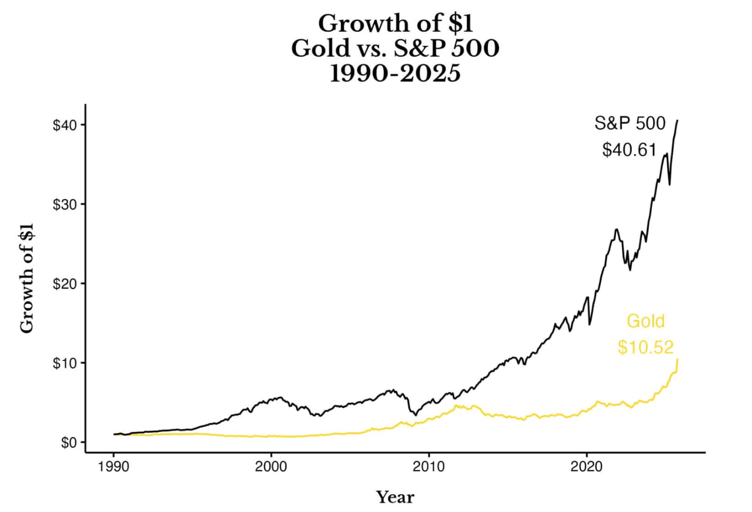 С 1990 года $1 в S&P 500 вырос примерно в четыре раза больше (черная линия), чем $1 в золоте (желтым).